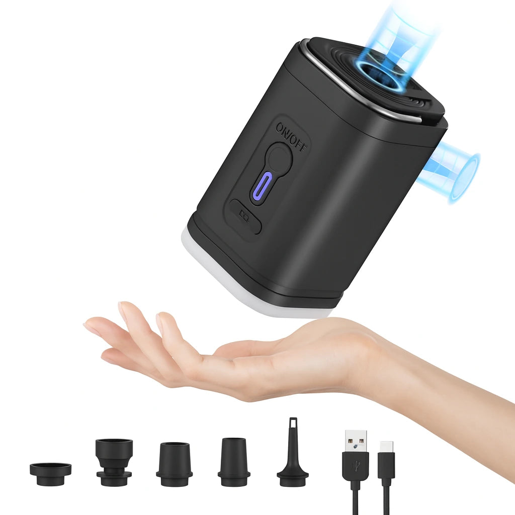 La Mini Bomba de Aire Portátil VALTOBAG es el accesorio ideal para ahorrar tiempo y espacio. Su diseño ligero y recargable te permite inflar o desinflar rápidamente tus bolsas de almacenamiento VALTOBAG, flotadores, camas inflables y más — en casa, en la playa o en tus viajes.